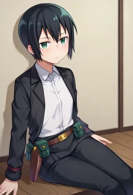 kinoSDXL,1girl,solo,short hair,shirt,black hair,long sleeves,jacket,white shirt,collared shirt,belt,pants,black jacket,gun,black pants,green eyes,pouch,brown belt,holster,belt pouch,tomboy,kino (kino no tabi)