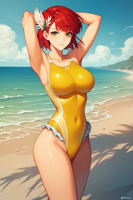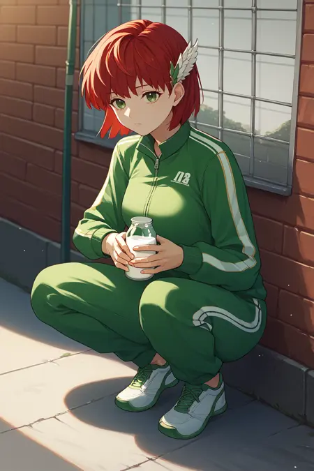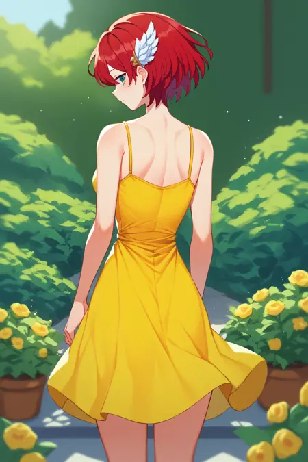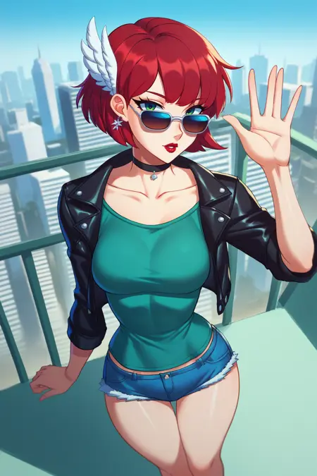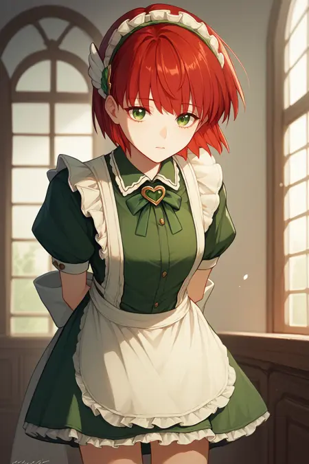 주요 프롬프트: NSPriscillaFE7, 빨간 머리, 녹색 눈, 단발, 날개 모양 머리 장식