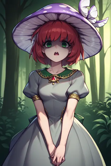 For the outfit please use: NSPriscillaFE7, red hair, green eyes, short hair, wing hair ornament, white skirt, green blouse, sleeveless, transparent capelet, elbow gloves, green hood