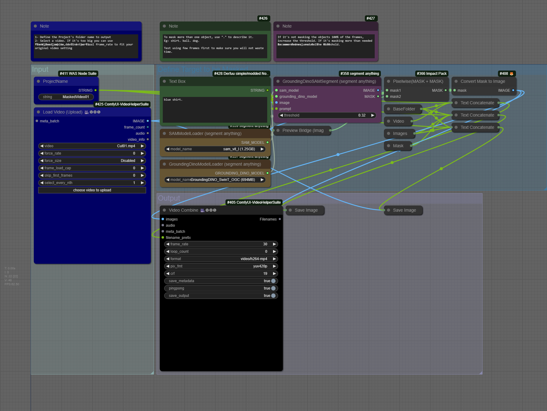 これは、私の動画や画像で要素を選択する際に使用するシンプルなワークフローです。正しく使用すれば非常に強力で、マスク作成にかかる時間を大幅に削減できます。このワークフローは、他のワークフローと組み合わせることで優れた結果を得ることができます。結果を使用する前に、マスクを少し拡張することを推奨します(Comfyでは「GrowMask」と「Mask Blur」ノードを使用してください)。CivitAIには、特定のマスク領域を利用する多くのワークフローがあり、これらはこのワークフローで簡単に作成できます。このワークフローは、以下の3つの出力を生成します:マスク(白黒)が付いた動画、マスク(白黒)の画像が格納されたフォルダー、および元の動画フレームを画像として格納したフォルダー。これにより、動画を直接他のワークフローで使用したり、Comfy、A1111、またはお好みの他のソフトウェアに画像シーケンスを読み込むことができます。