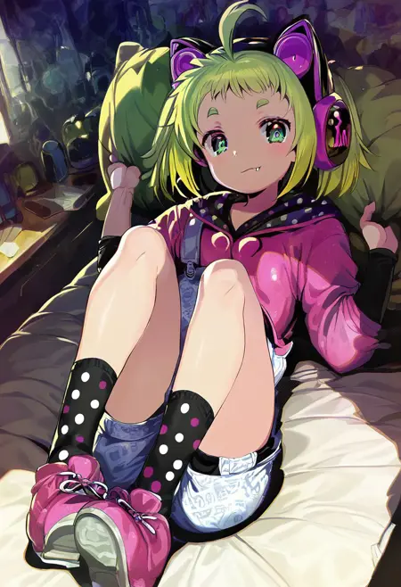 Outfit: pink headphones, backpack, bag, polka dot legwear, black socks, overall shorts, long sleeves, overalls, hoodie, pink hoodie, hood, hood down, sneakers, pink footwear, polka dot,