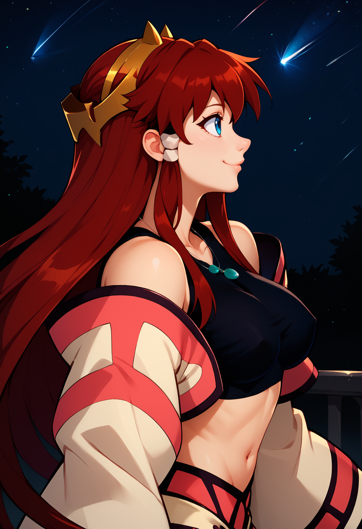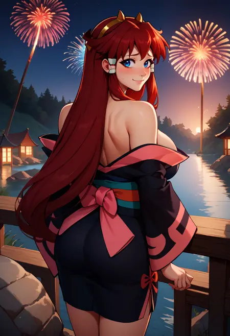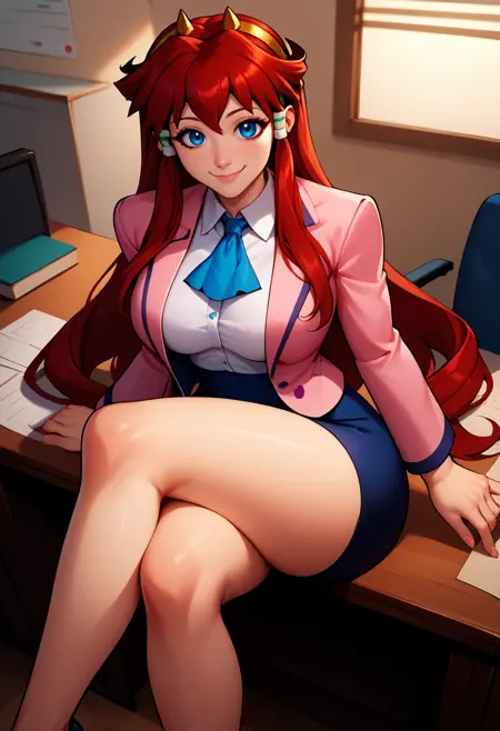 トリガー: 正確さを確保するために、必ず「ditlieb、青い目、長い髪、サイドロックス、髪のチューブ、赤い髪、大きな胸、ヘアバンド、角」を含めてください。