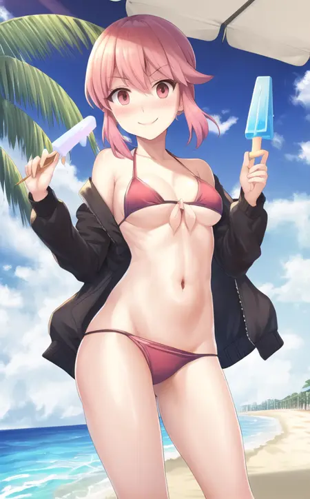 ヌーディストビーチ姿には (jakuzure nonon), (black soft hat), (holster), (black gloves), (utility belt), (shoulder holster) を使用してください