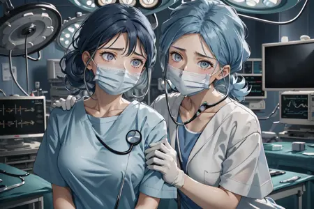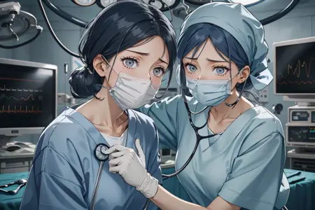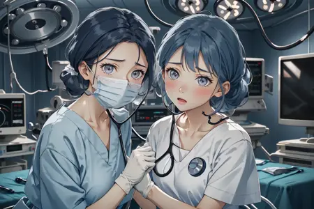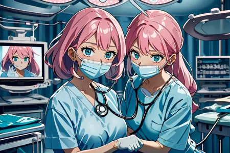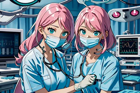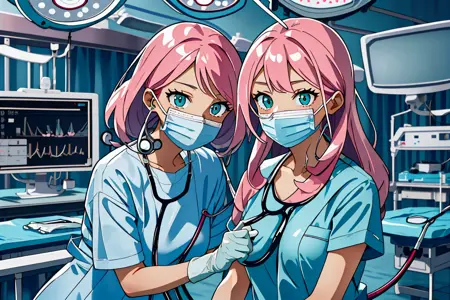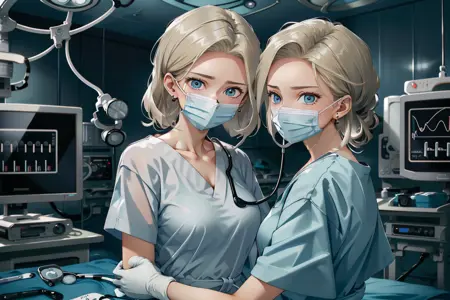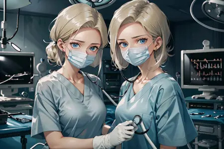 2girls, scene_surgexamnurse, surgical mask, doctor, stethoscope, gloves,