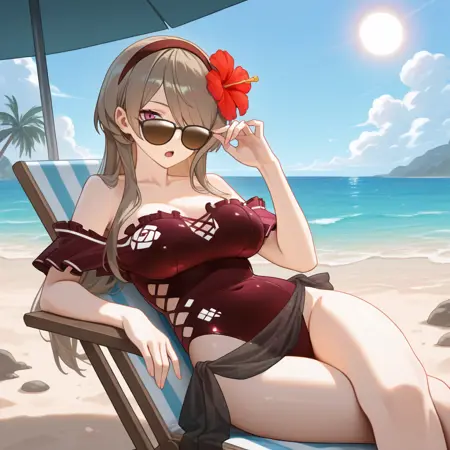 Rita, Fol005, Ri_Swm, rita rossweisse, brown hair, hair over one eye, purple eyes, maroon one-piece swimsuit, strapless swimsuit, off-shoulder swimsuit, maroon swimsuit, sunglasses, maroon headband, see-through sarong, black sarong, red flower, alternative hair flower,