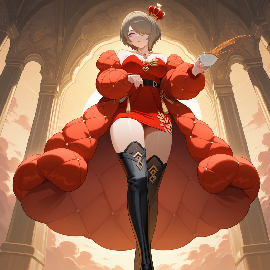 Rita, Fol001, Ri_Que, rita rossweisse, brown hair, hair over one eye, purple eyes, strapless dress, red dress, puffy coat, open coat, red coat, puffy long sleeves, gold trim, jewelry, black belt, cleavage, necklace, mini crown, thigh boots, alt black footwear,