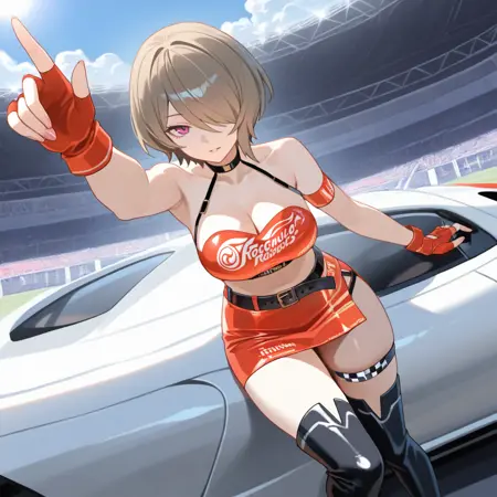 Rita, Fol005, Ri_Rcq, rita rossweisse, brown hair, hair over one eye, purple eyes, tube top, red crop top, red shirt, race queen, alt shoulder straps, alt black choker, cleavage, miniskirt, red skirt, black belt, fingerless gloves, red gloves, alternative thigh boots, another black footwear, alt black thigh strap, alternate cleavage cutout,