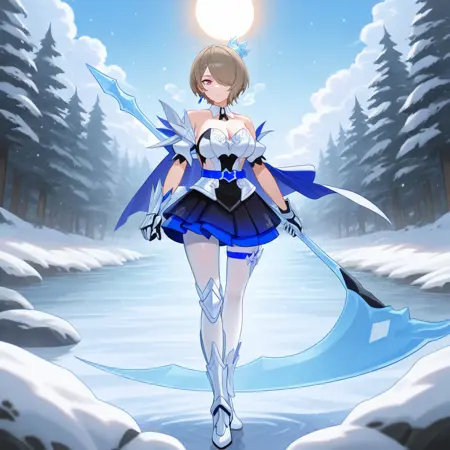 Rita, Fol002, Ri_Agk, rita rossweisse, brown hair, hair over one eye, purple eyes, alt strapless dress, black dress, two-tone skirt, alternate black skirt, blue skirt, alt pleated skirt, chestplate, cleavage, blue belt, white gloves, short gloves, alt armored gloves, blue crown, single earring, detached collar, bare shoulders, blue cape, short cape, alternate detached sleeves, armored sleeves, short sleeves, white armor, clothing cutout, white pantyhose, alt pantyhose, blue thigh strap, single knee pad,