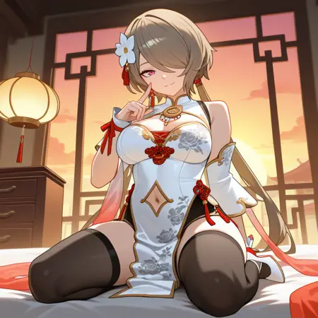 Rita, Fol003, Ri_Moc, rita rossweisse, brown hair, hair over one eye, purple eyes, china dress, alt white dress, low twintails, red ribbon, see-through shawl, gradient shawl, navel cutout, pelvic curtain, underwear, alt black thighhighs, alt thighhighs, alternate jewelry, alternate detached sleeves, alt white sleeves, wide sleeves, white wrist cuffs, wrist ribbon, chinese clothes, white collar, alt necklace, alt single earring, hair flower, alt white flower, cleavage cutout,