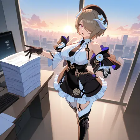 UR_Imb, white shirt, frilled shirt, collared shirt, black necktie, thigh cutout, sleeveless shirt, bare shoulders, black capelet, capelet, jewelry, horn hair ornament, high-waist skirt, black skirt, garter straps, single horn, white horn, white leggings, thigh cutout, clothing cutout, thigh boots, black footwear, hair flower, white flower, beret, black headwear, alt black gloves, frilled skirt, alternate detached sleeves, medium sleeves, white sleeves,
