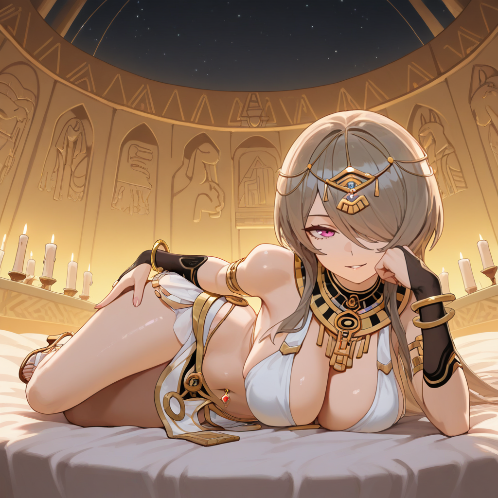 Ri_Egp, short hair with long locks, circlet, alternate necklace, microskirt, egyptian clothes, navel piercing, black bridal gauntlets, armlet, gold bracelet, black collar, white bikini, dancer outfit, alt jewelry,