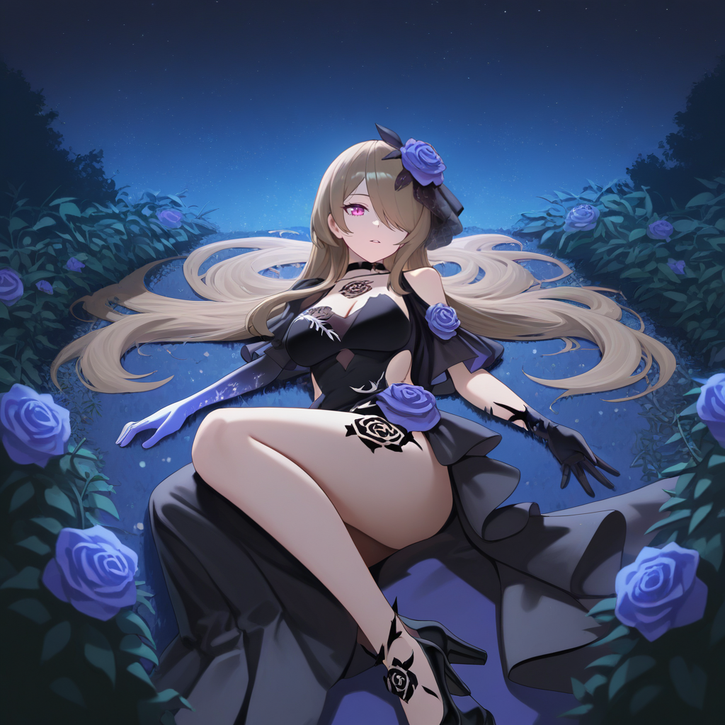 脚のタトゥー、ドレス、黒いドレス、胸のタトゥー、黒い手袋、肘まで手袋、片袖、青い薔薇、長い袖、髪飾り、胸元、