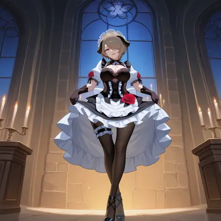 Rita, Fol001, Ri_Def, rita rossweisse, brown hair, hair over one eye, purple eyes,maid apron, white apron, black skirt, layered skirt, frilled corset, black corset, white frills, puffy short sleeves, white sleeves, red rose, black bra, black pantyhose, pantyhose, frilled thigh strap, white bow, maid headdress, black gloves, elbow gloves, horns, neck ribbon, black collar, cleavage cutout, bodystocking, bridal garter,