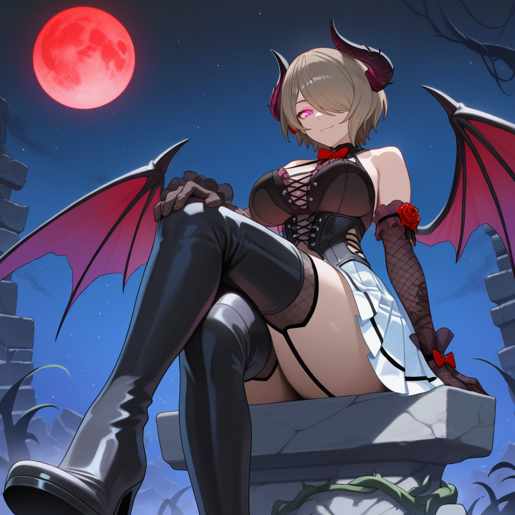 Rita, Fol002, Ri_Hal, rita rossweisse, brown hair, hair over one eye, purple eyes, halloween costume, fake horns, black horns, alternate thigh boots, alternative black footwear, alt garter straps, cross-laced corset, alt black corset, halterneck, fishnets, fishnet gloves, long gloves, black frills, cross-laced clothes, red rose, demon girl, demon wings, pleated skirt, white skirt, red bow, bowtie, covered navel, black wrist cuffs, cross-laced collar, alt black collar, covered breasts,