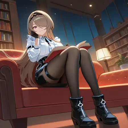 Rita, Fol003, Ri_Smd, rita rossweisse, brown hair, hair over one eye, purple eyes, very long hair, collared shirt, alt white shirt, frilled shirt, center frills, alternate white sleeves, long sleeves, alt wrist ribbon, white ribbon, black ribbon, neck ribbon, red flower, alternative black gloves, alternate gloves, pencil skirt, zipper skirt, different black skirt, arm strap, hairband, black thigh strap, alt black pantyhose, alternate pantyhose,