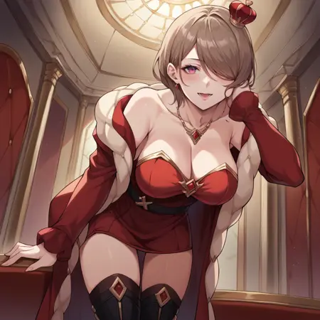 Rita, Fol001, Ri_Que, rita rossweisse, brown hair, hair over one eye, purple eyes, strapless dress, red dress, puffy coat, open coat, red coat, puffy long sleeves, gold trim, jewelry, black belt, cleavage, necklace, mini crown, thigh boots, alt black footwear,