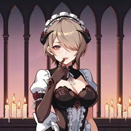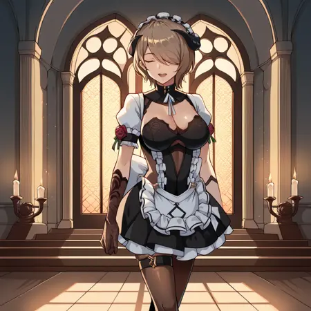 Rita, Fol001, Ri_Def, rita rossweisse, brown hair, hair over one eye, purple eyes, maid apron, white apron, black skirt, layered skirt, frilled corset, black corset, white frills, puffy short sleeves, white sleeves, red rose, black bra, black pantyhose, pantyhose, frilled thigh strap, white bow, maid headdress, black gloves, elbow gloves, horns, neck ribbon, black collar, cleavage cutout, bodystocking, bridal garter,