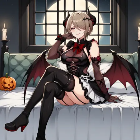 Rita, Fol002, Ri_Hal, rita rossweisse, brown hair, hair over one eye, purple eyes, halloween costume, fake horns, black horns, alternate thigh boots, alternative black footwear, alt garter straps, cross-laced corset, alt black corset, halterneck, fishnets, fishnet gloves, long gloves, black frills, cross-laced clothes, red rose, demon girl, demon wings, pleated skirt, white skirt, red bow, bowtie, covered navel, black wrist cuffs, cross-laced collar, alt black collar, covered breasts,