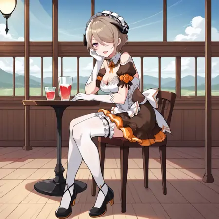 UR_Alt, shoulder cutout, cleavage cutout, alt elbow gloves, white gloves, alt layered skirt, brown skirt, orange skirt, white apron, frills, alt corset, white corset, bodystocking, center opening, center cutout, white bra, detached collar, white collar, turtle neck, orange ribbon, neck ribbon, white bow, orange rose, white thighhighs, thighhighs, frilled thigh strap, orange thigh strap, maid headdress, horns, hair ornament, short puffy sleeves, brown sleeves,