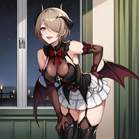 UR_Suc, 他の黒い履物, 他の太ももブーツ, 他のガーター紐, ハロウィンコスチューム, 偽の角, 黒いドレス, アクセサリー, サイドレスドレス, 黒い角, 他の角, 悪魔の少女, 悪魔の翼, 他の髪飾り, 赤いバラ, ハルタードレス, 胸を覆う, フィッシュネット, 白いスカート, プリーツスカート, 赤いリボン, ボウタイ, 他の黒い首輪, 黒い手首カフ, 腹部を覆う, 交差リボン服, 黒いフリル, フィッシュネット手袋, 長手袋,