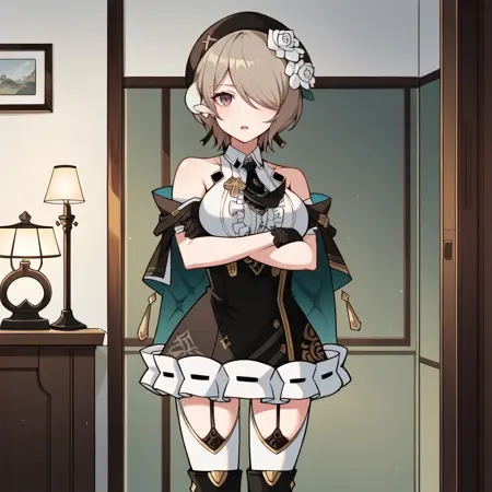 Rita, Fol001, Ri_VD, rita rossweisse, brown hair, hair over one eye, purple eyes, white shirt, halter shirt, black necktie, bare shoulders, thigh cutout, white leggings, garter straps, black garter straps, alt thigh boots, alternate black footwear, high-waist skirt, alt black skirt, frilled skirt, off-shoulder capelet, black capelet, horn hair ornament, single horn, white horn, clothing cutout, black headwear, beret, hat flower, white flower, alt black gloves, gloves, detached sleeves, sleeves past elbows, white sleeves,