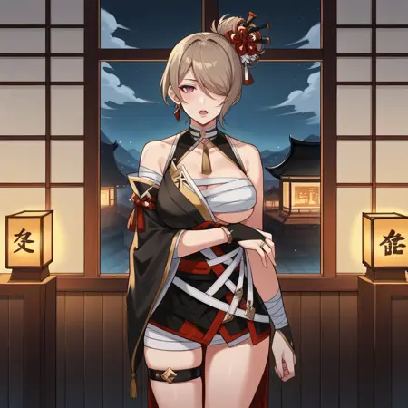 UR_JP, 日本服, 着物, 黒い着物, 非対称な服, 髪結び, 単一の髪結び, 胸巻き, 包帯, 髪の花, 他の髪飾り, アクセサリー, 片袖, 黒い袖, ピアス, 非対称な袖, 黒い手袋, 結婚式用手袋, 広い袖, 黒い太ももストラップ, 下胸元,