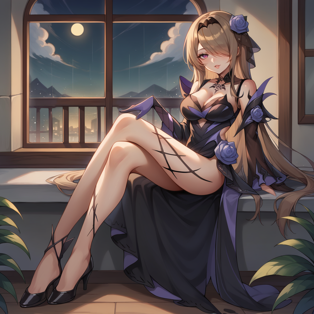 Rita, Fol003, Ri_Frs, rita rossweisse, brown hair, hair over one eye, purple eyes, very long hair, dark blue rose, black veil, alt hair flower, shoulder cutout, black choker, bare shoulders, alt black dress, long dress, side cutout, clothing cutout, shoulder straps, frilled dress, long skirt, alternative black skirt, side slit, tattoo on thigh, leg tattoo, chest tattoo, cleavage, single elbow glove, purple gloves, gradient gloves, thorn print, purple trim, asymmetrical sleeves, short sleeve, alternative detached sleeves, long sleeve, alt wide sleeves, pleated sleeves, black sleeves,