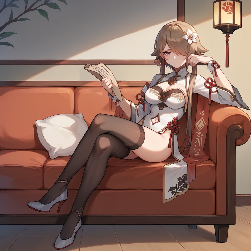Rita, Fol003, Ri_Moc, rita rossweisse, brown hair, hair over one eye, purple eyes, china dress, alt white dress, low twintails, red ribbon, see-through shawl, gradient shawl, navel cutout, pelvic curtain, underwear, alt black thighhighs, alt thighhighs, alternate jewelry, alternate detached sleeves, alt white sleeves, wide sleeves, white wrist cuffs, wrist ribbon, chinese clothes, white collar, alt necklace, alt single earring, hair flower, alt white flower, cleavage cutout,