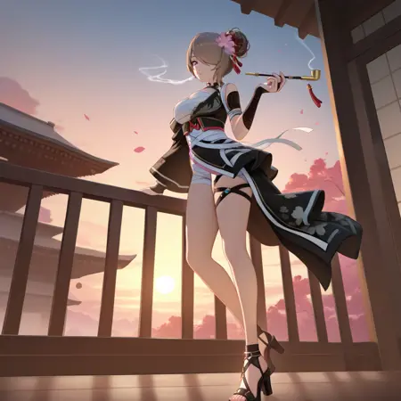 UR_JP, japanese clothes, kimono, black kimono, asymmetrical clothes, hair bun, single hair bun, chest sarashi, bandages, hair flower, alt hair ornament, jewelry, single sleeve, black sleeves, earrings, asymmetrical sleeves, black gloves, bridal gauntlets, wide sleeves, black thigh strap, underbust,