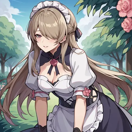 Rita, Fol001, Ri_Def, rita rossweisse, brown hair, hair over one eye, purple eyes,maid apron, white apron, black skirt, layered skirt, frilled corset, black corset, white frills, puffy short sleeves, white sleeves, red rose, black bra, black pantyhose, pantyhose, frilled thigh strap, white bow, maid headdress, black gloves, elbow gloves, horns, neck ribbon, black collar, cleavage cutout, bodystocking, bridal garter,
