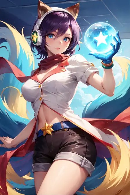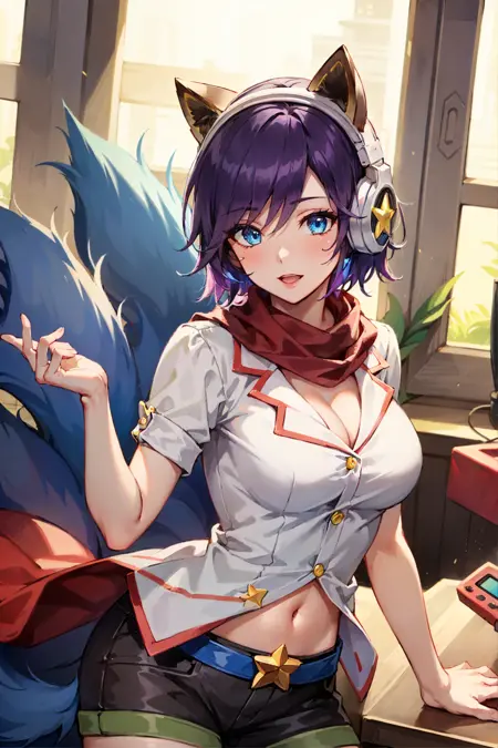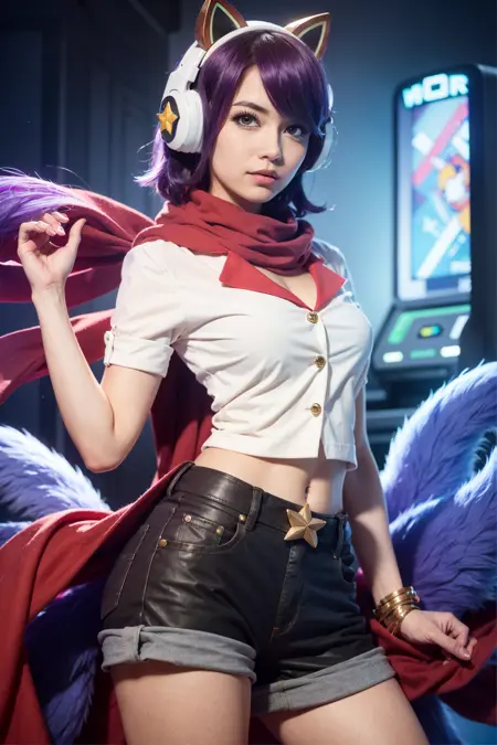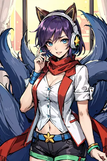 标签:1girl,ahri(league of legends),街机阿狸,耳机,红围巾,多条尾巴