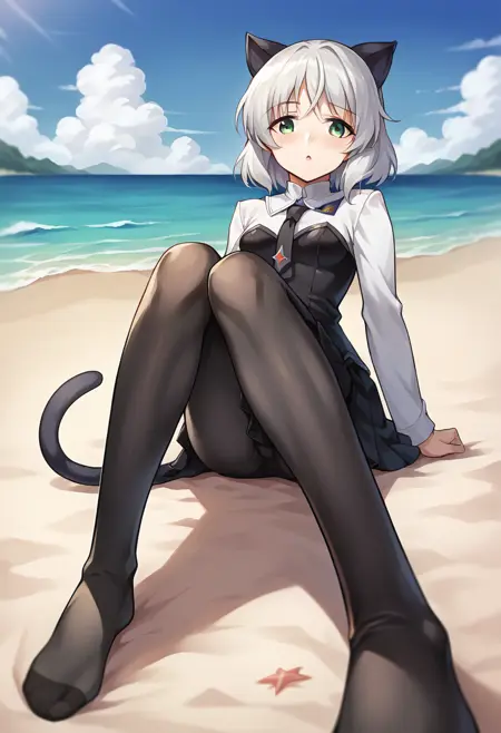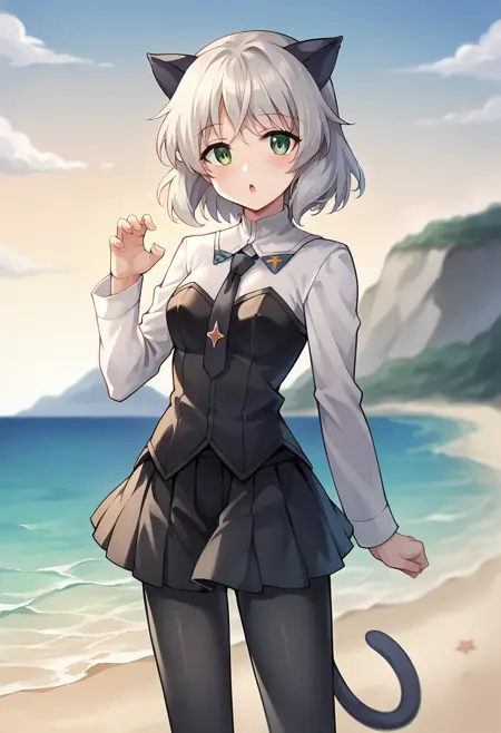 score_9, score_8_up, score_7_up, source_anime, masterpiece, 1girl, ctiansanya, uniform, necktie, strapless vest, long sleeves, black skirt, black pantyhose, beach, outdoors, cowboy shot, sunny, ocean, scenery, depth of field, looking at viewer, cinematic,