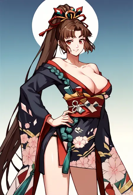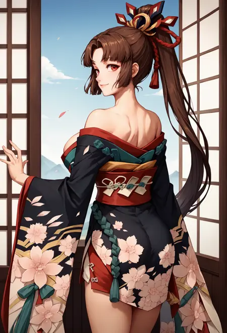 • yotokta, 长马尾,发饰,露肩和服,黑色和服,露胸,腰带,花卉图案,棕发,红眼睛,极长头发,