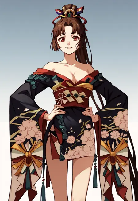 yotokta, 长马尾,发饰,露肩和服,黑色和服,露胸,腰带,花卉图案,棕发,红眼睛,极长头发,