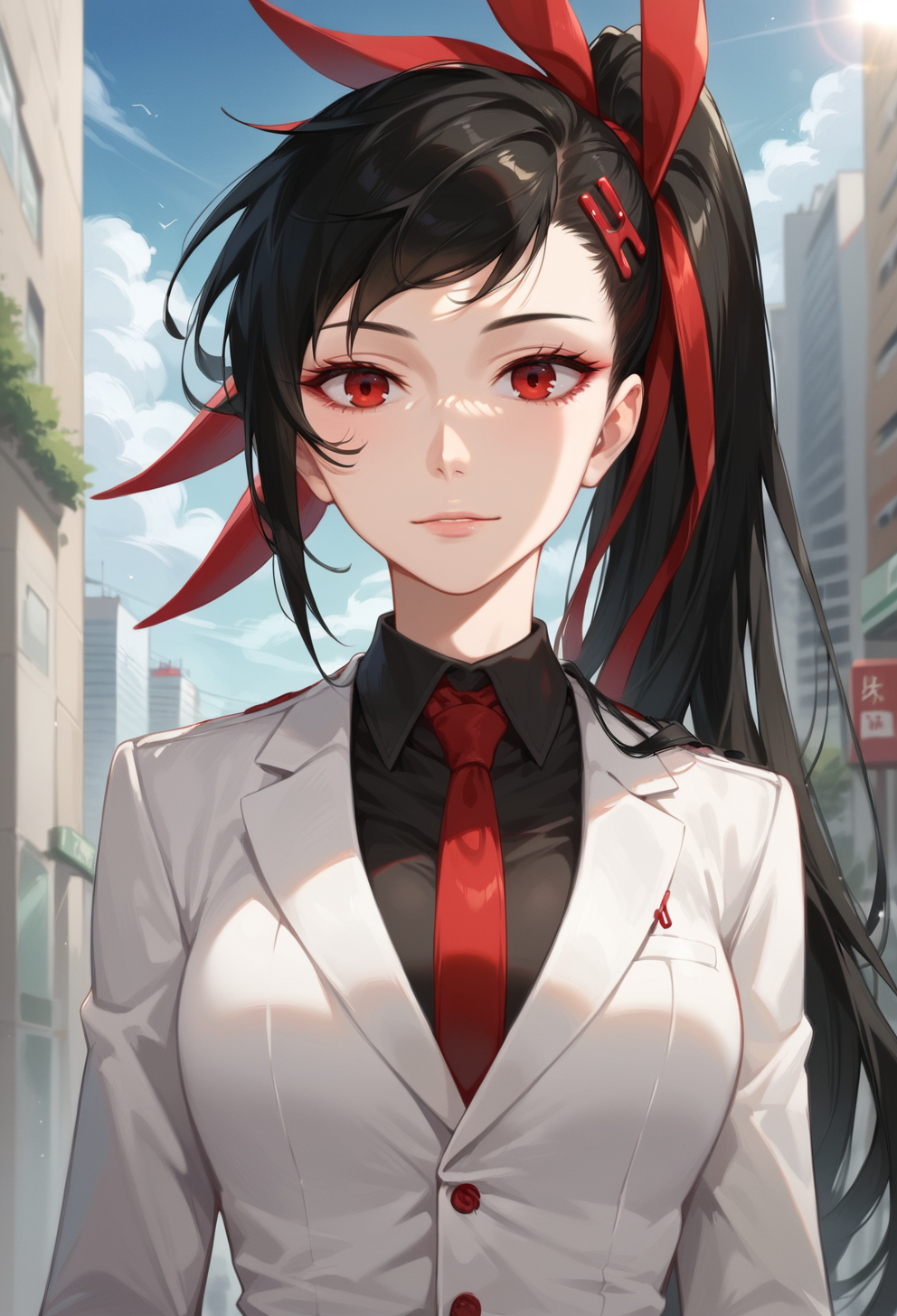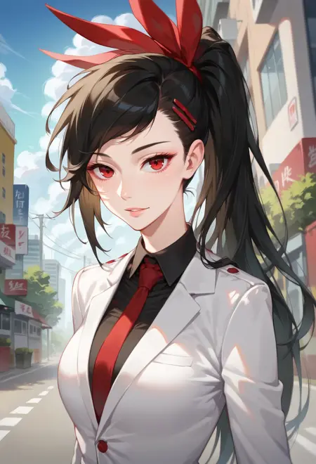HaYuriZahardV3, black hair, long hair, black hair, red ribbon, hair ribbon, ponytail, red hairpin, red eyes, bangs,