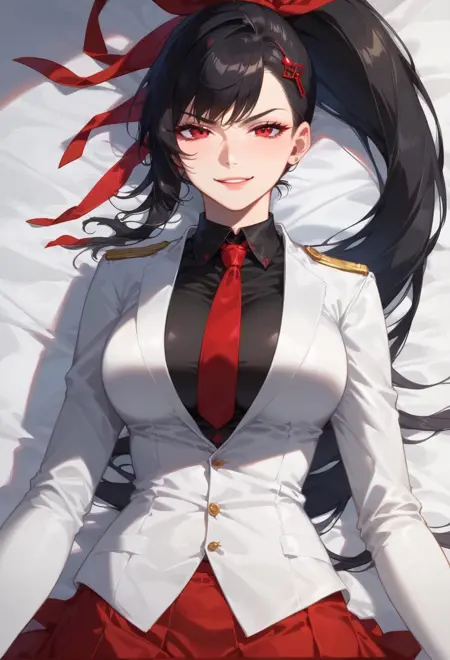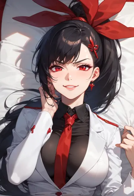 yurizahardD, score_9, score_8_up, score_7_up, score_6_up, yurizahard, black hair, long hair, black hair, red ribbon, hair ribbon, ponytail, hairpin, red eyes,