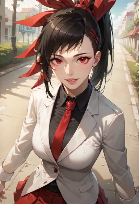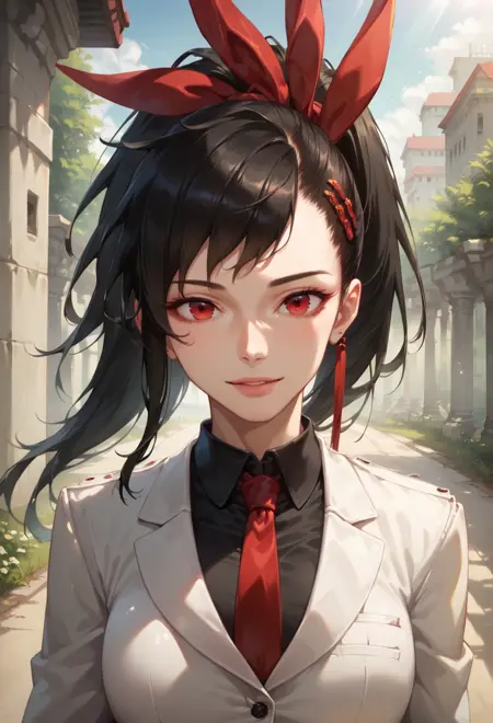 HaYuriZahardV2, black hair, long hair, black hair, red ribbon, hair ribbon, ponytail, red hairpin, red eyes, bangs,