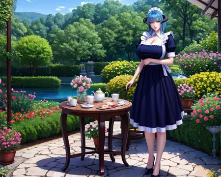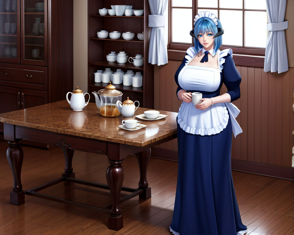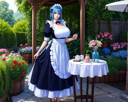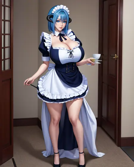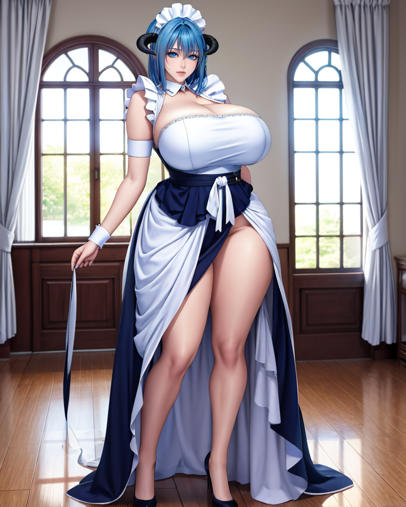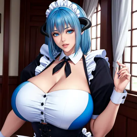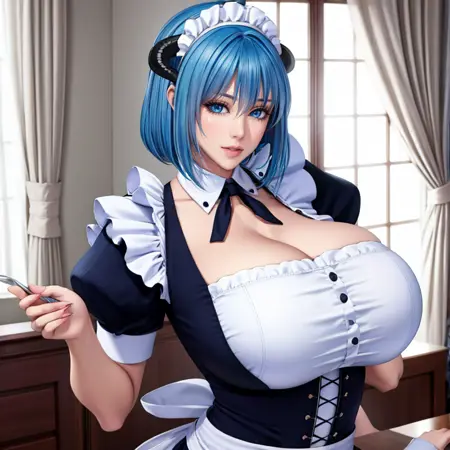 1girl, cyanbaru, solo, large breasts, blue hair, horns, huge breasts, blue eyes, maid, maid headdress