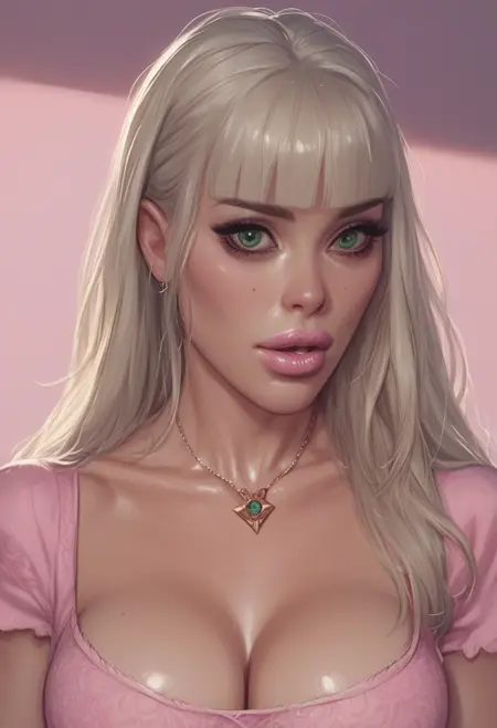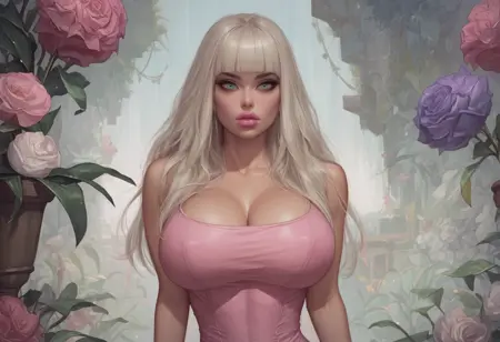 1girl, long hair, blonde hair, dress, green eyes, bodysuit, pink bodysuit, blush, large breasts, mascara, nipples, eyelashes, pink leotard, stiletto heels, leotard, gagged, ball gag, cleavage, jewelry, ass, thighs, dark skin, dark-skinned female, ring, huge breasts, bracelet, covered nipples, dark-skinned female, lips, makeup, short dress, lipstick, pink dress, eyeshadow, curvy, handbag, thick thighs, nail polish, black eyes, blunt bangs, high heels