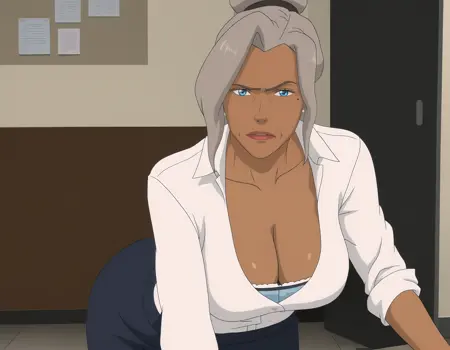 t10k2axlre, 1girl, blue eyes, dark-skinned female, dark skin, grey hair, mature female