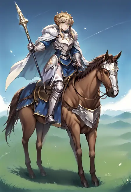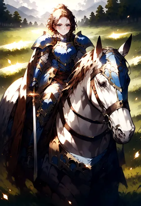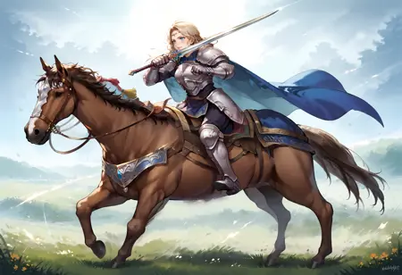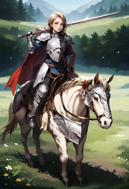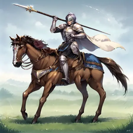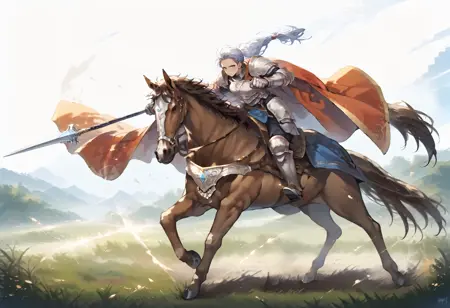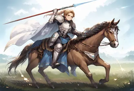 Optional words : knight, armor, cape, gloves, helmet, holding sword, holding spear