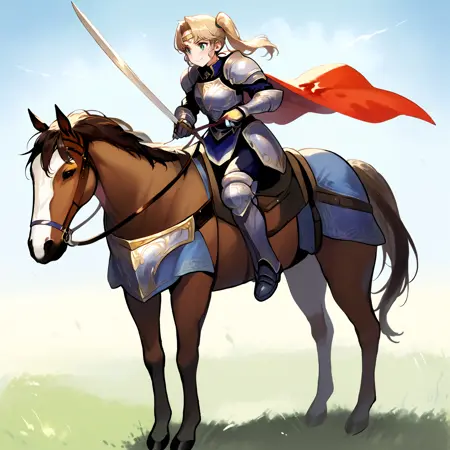 Optional words : knight, armor, cape, gloves, helmet, holding sword, holding spear
