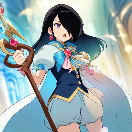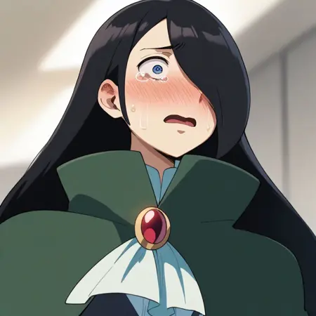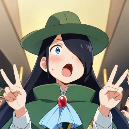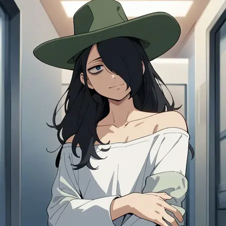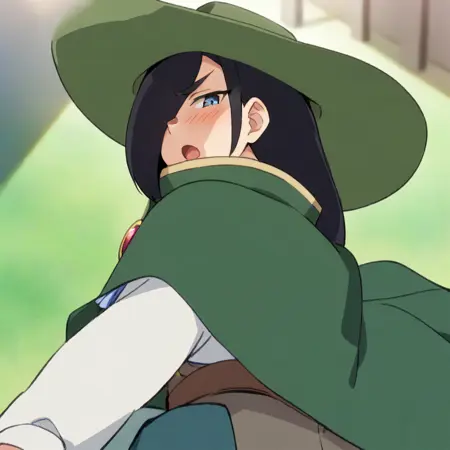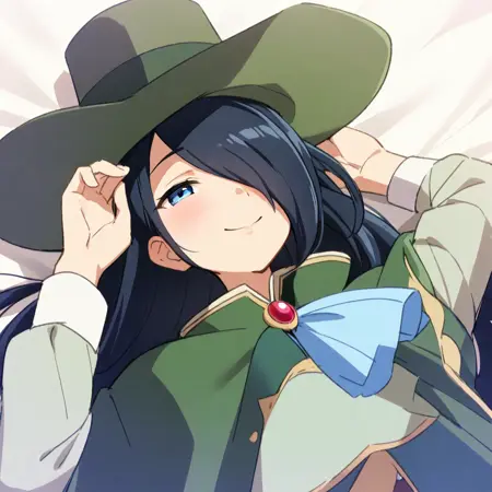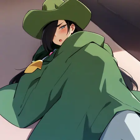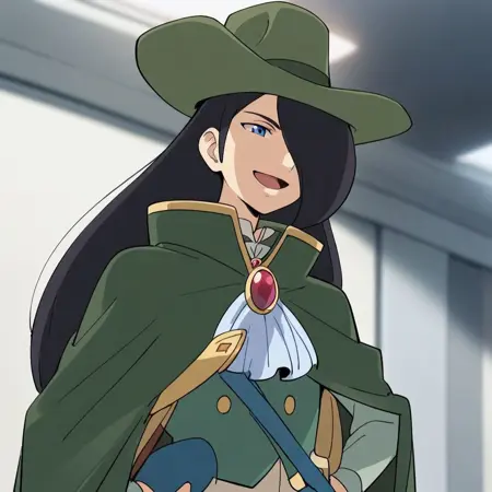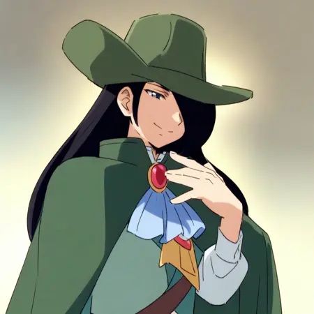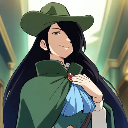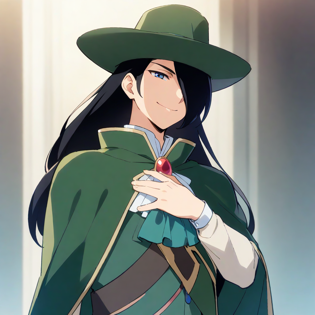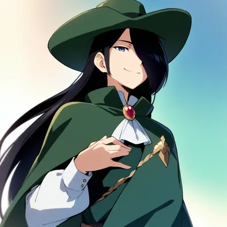1boy, male focus, long hair, black hair, blue eyes, hair over one eye, brooch, white ascot, green cape, hat, green headwear