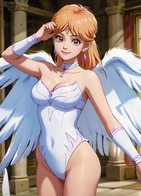 • 白色翅膀比基尼/连体衣: [ leonadq2020, 1girl, 单人, 金发, 长发, 棕色眼睛, 天空, 深V, 连体衣, 白色项圈, 羽翼, 橙色头发, 马尾, 天使之翼, 白色翅膀, 白色连体衣, 微笑, 性感姿势 ]