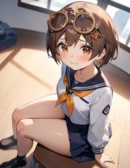 felllowmoon-qianqiu,1girl,solo,brown hair,gloves,short hair,orange jacket,fingerless gloves,bike shorts,brown eyes,black gloves,hair ornament,jacket,shorts,glasses,skirt,eyewear on head,goggles,
