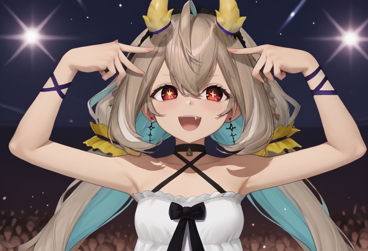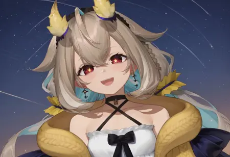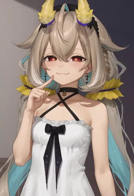 Nasa2nd, bangs, very long hair, red eyes, white dress, twintails, multicolored hair, bare shoulders, low twintails, collarbone, brown hair, black choker, halterneck, horns, tail, short dress, hair ornament, earrings, hair between eyes, leg ribbon, criss-cross halter, ahoge, black bow, claws, yellow jacket, long sleeves, hairband, blue hair, off shoulder, sleeveless dress, cardigan,