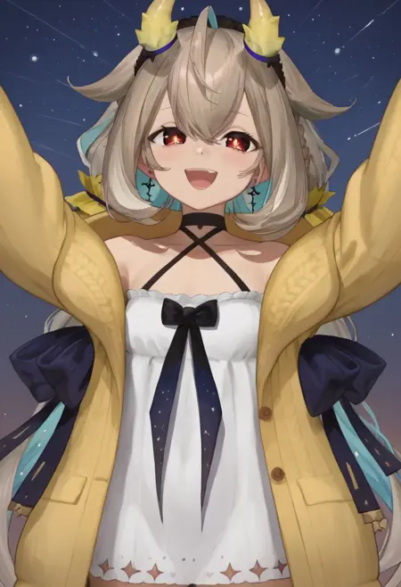 Nasa2nd, 앞머리, 매우 긴 머리카락, 붉은 눈, 흰 드레스, 트윈테일, 다색 머리카락, 드러난 어깨, 낮은 트윈테일, 클라비클, 갈색 머리카락, 검은 총구, 해터넥, 뿔, 꼬리, 짧은 드레스, 머리 장식, 귀걸이, 눈 사이의 머리카락, 다리 리본, 십자 해터넥, 아호게, 검은 리본, 발톱, 노랑 재킷, 긴 소매, 머리끈, 파란 머리카락, 어깨 드러냄, 소매 없는 드레스, 카디건,
