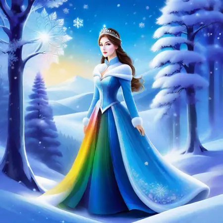 1girl with prominent eyes, standing in a snowy winter forest, snowflakes gently falling on her, trees heavily laden with snow, expression of serene determination, wearing warm, stylish rainbow winter attire, soft glow from the snow's reflection on her face, capturing the tranquility of the scene, in a digital painting, ultra clear, with a touch of magical realism,