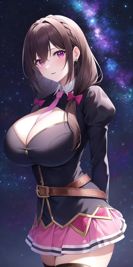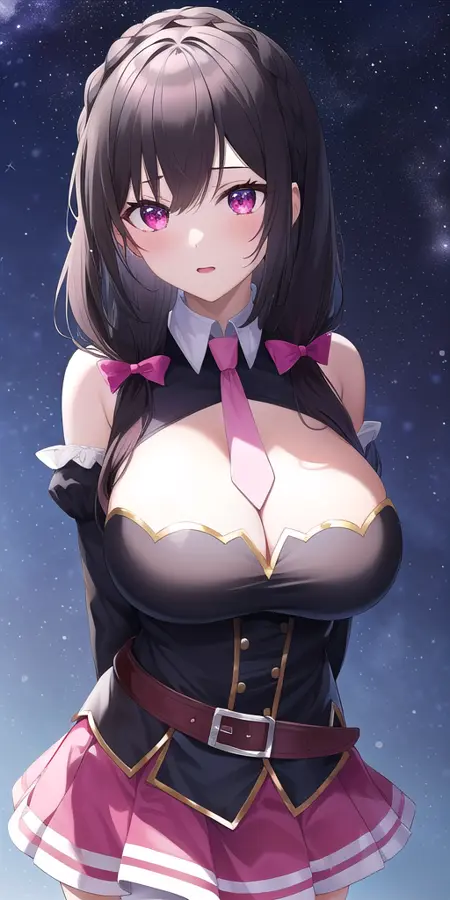 Bblack_shirt_wing_collar_cleavage_cutout_juliet_sleeves_white_wrist_cuffs_pink_necktie_pink_layered_skirt_brown_belt_thighhighs: her classic outfit.