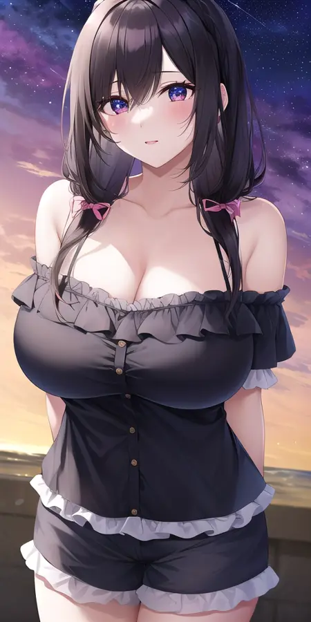 Black_frilled_shirt_black_frilled_shorts_off_shoulder_short_sleeves_pink_frills: I think this is a canon outfit but i don't remember exactly, this version is pajama based on Kamagabuchi(Hatanaka)'s Pajama Party doujin.